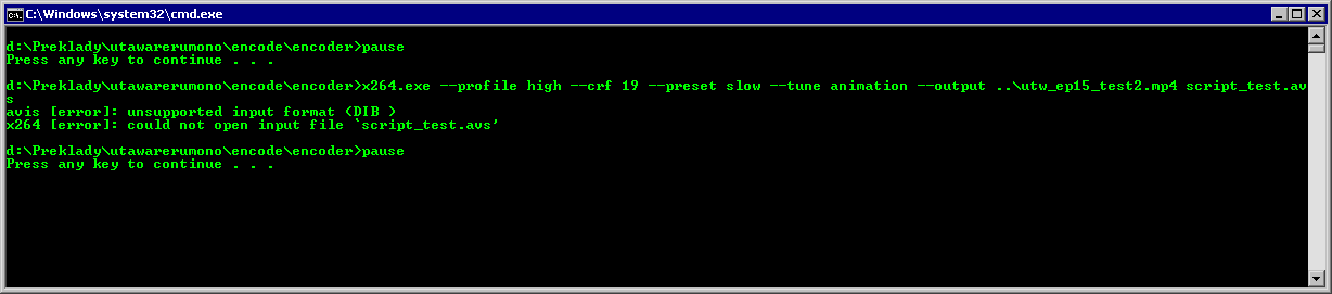 –crf– constant quality mode (variable bitrate), lower number means higher quality, sane range of values is 15-25. Higher the resolution is, higher values you can use. There is also –bitrate option sets constant bitrate (in kB/s) – do not use this unless you REALLY need predictable filesize!–preset– controls speed/compression ratio – slower speed means better compression and smaller output file.–tune– presetted tunning for film, animation, grain, stillimage, psnr, ssim, fastdecode, zerolatency. If you don’t really fit into any of them, don’t use it at all.encoded_video.mp4is output file,AVS_script.avsis input file.pause– that is command for windows CMD to wait for a keystroke.